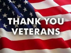 • American flag background with 'Thank You Veterans' text.